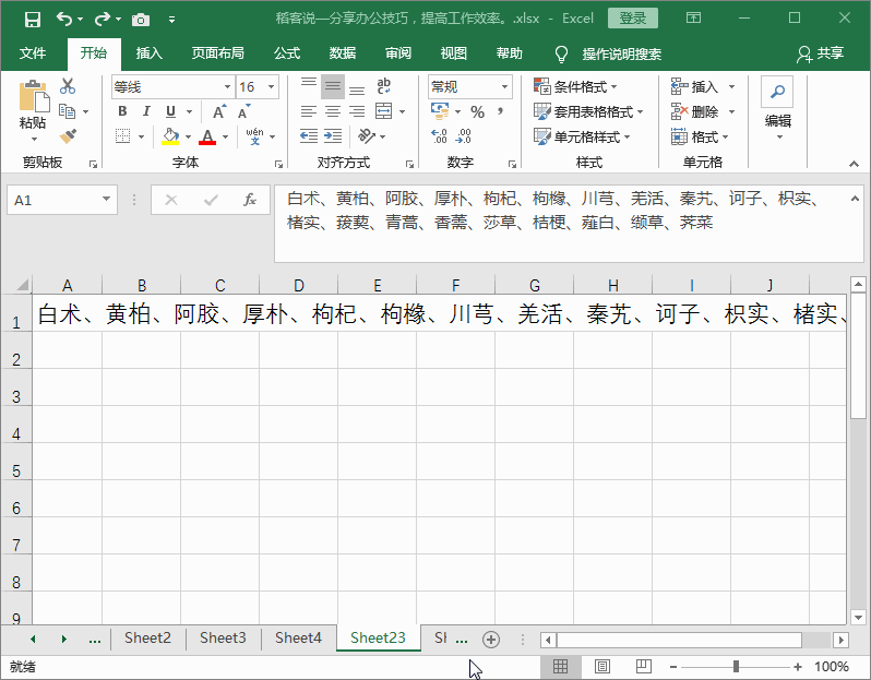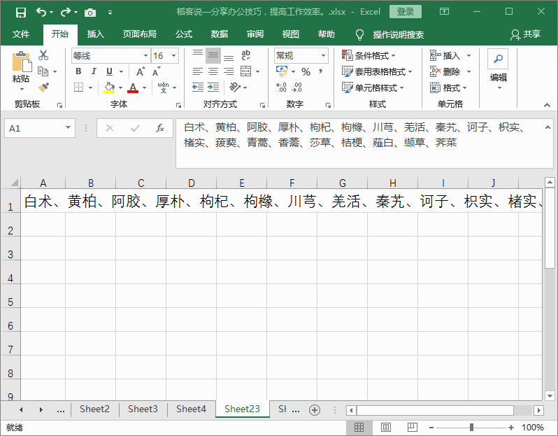 再看下图,在A1单元格中有20味中药的名称, 假如现在需要将每一味中药单独放在一行中,应该如何实现呢?