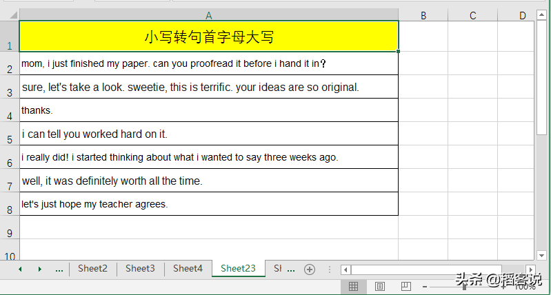 从下图中可以看到,表格中的英文对白都是小写的,如若要将其改成句首字母大写,又该如何操作呢?