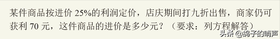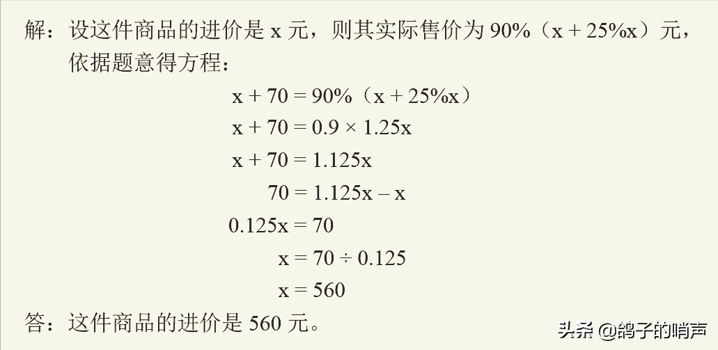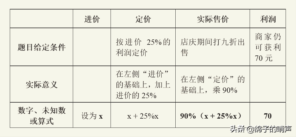 现在是不是清楚多了?我们再根据“进价 + 利润 = 售价”的数量关系,就可以列出方程。于是,解题过程如下: