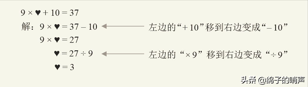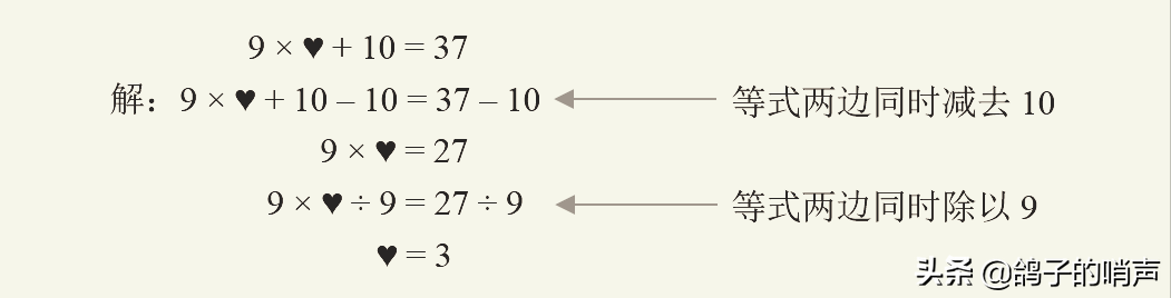 孩子们从四年级左右开始接触代数和方程,单纯的“解方程”几乎都不存在太大的问题,一开始采用“等式的基本性质”:等式的等号左右两边,同时加上、减去、乘以、除以(除数不为0)同一个整式(可以是数、未知数、算式、符号),等式仍然成立。