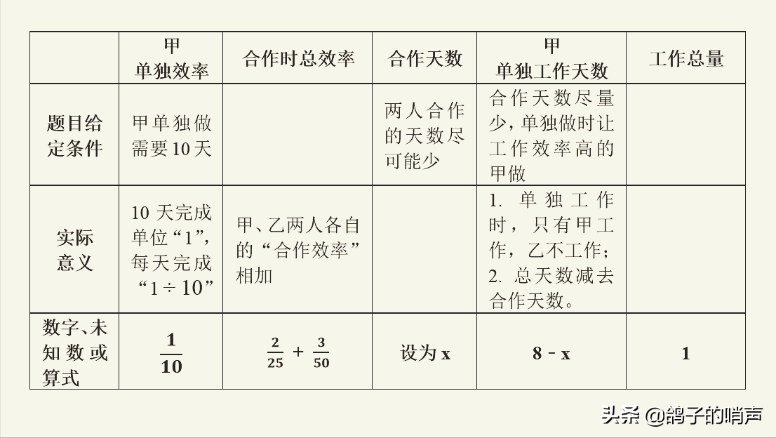 题目明确“两人合作的天数尽可能少”,并且提示“合作天数尽量少,单独做时让工作效率高的甲做”。所以,列出表格后,我们可以明确,表①中,后续计算时会使用的量,只有“甲单独效率”(1/10)和“合作时总效率”(2/25 + 3/50),乙不单独工作,因此最终数量关系为: