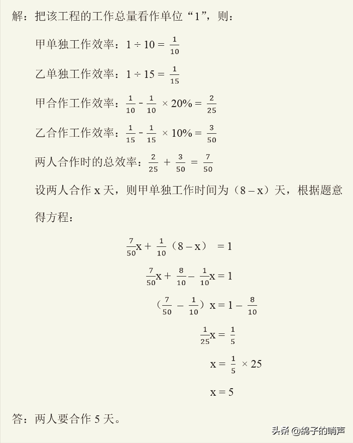 这个题目的数量关系是:工作效率 × 工作时间 = 工作总量(两个变式:工作总量 ÷ 工作效率 = 工作时间 或 工作总量 ÷ 工作时间 = 工作效率)。但题目涉及到甲、乙两人,还有两人合作,因此数量关系应该进行变形:
