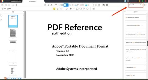(2)打开PDF文件后,在右上角的“搜索”按钮后的空白处输入关键词,再点击回车键,并查找到关键词所在段落内容,点击可以直接跳转到所在页面。