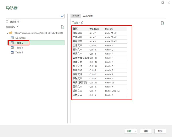因为这个网页有三个表格,所以左边显示有三个【Table】,我们找到我们需要的那个表格数据,这里是第一个【Table 0】
