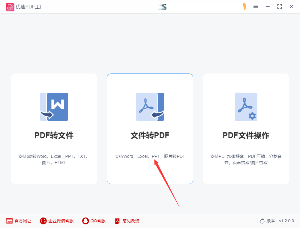 一、转换前用户需将所用到的工具“优速PDF工厂”下载安装到电脑上,随后打开使用,在软件首页面很容易的就能找到【文件转PDF】这个选项了,我们点击这个选项进入内页。