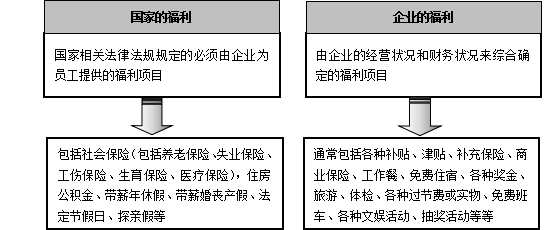 企业为员工提供的福利项目可分为两大类,国家的福利和企业的福利,具体内容如图7-19所示。