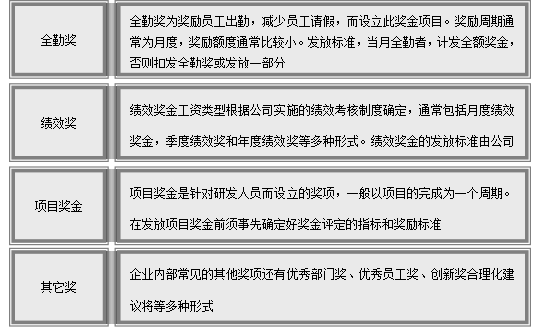 奖金工资是员工工资的重要补充,是企业激励员工的重要手段,是企业对员工超额劳动或劳动绩效突出部分支付的报酬。常见的奖金工资类型有以下几种。如图7-16所示。