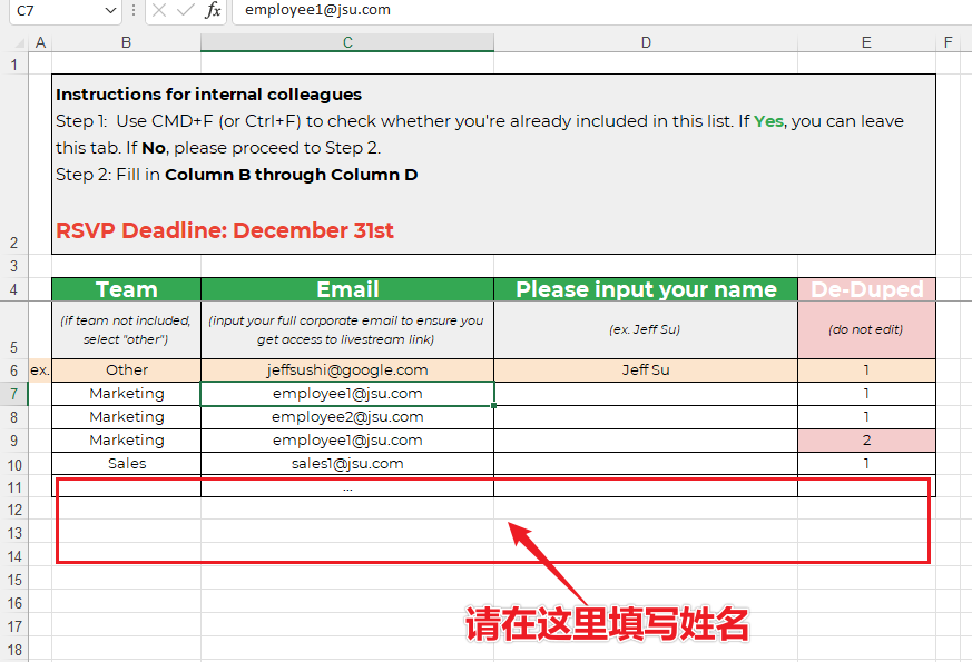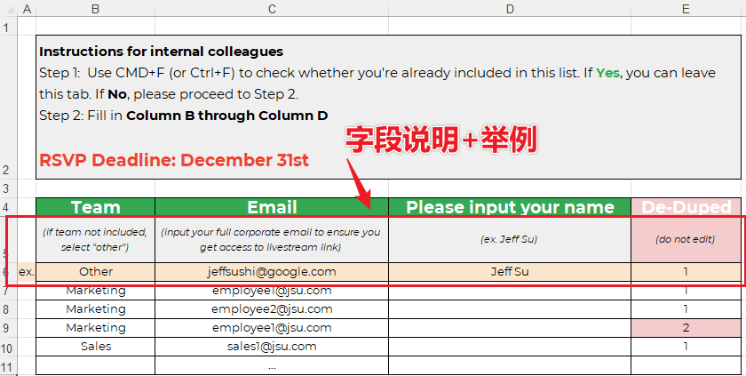 在标题下面,备注上字段的含义,或者在第2行中添加填写示例,既可以让读者感受到更好的填写体验,同时也可以规范好原始数据,避免错误数据的产生。