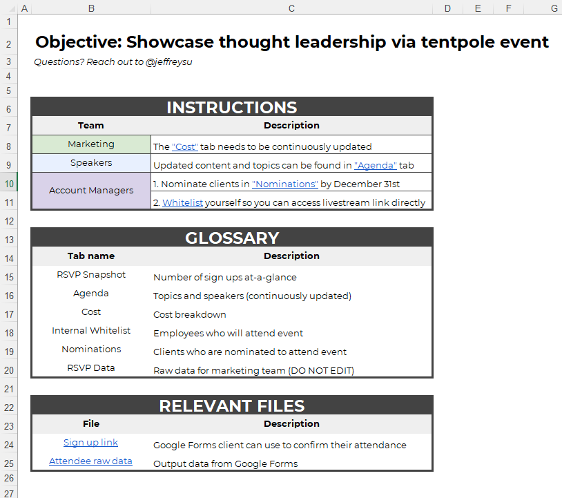 在每个工作表的顶部,添加说明,描述当前工作表的作用。让任何人都能看懂这一页要干什么。