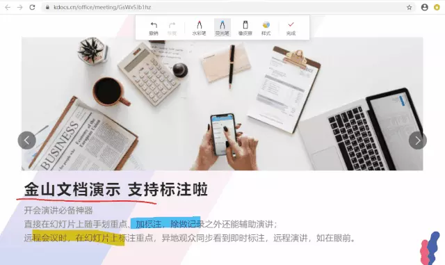 金山文档这次特地增加了水彩笔、荧光笔功能,播放PPT时点击工具条上的“标注”就可以使用了。