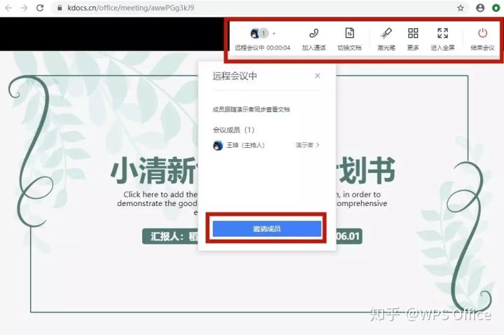 点击进入会议模式后,可以看到邀请成员,加入通话,切换文档,激光笔等等选项。