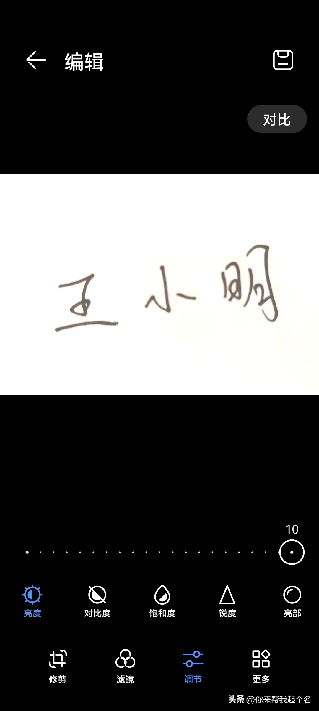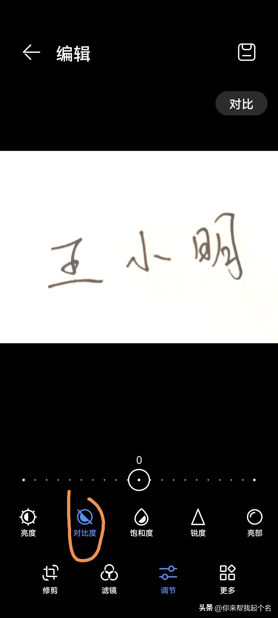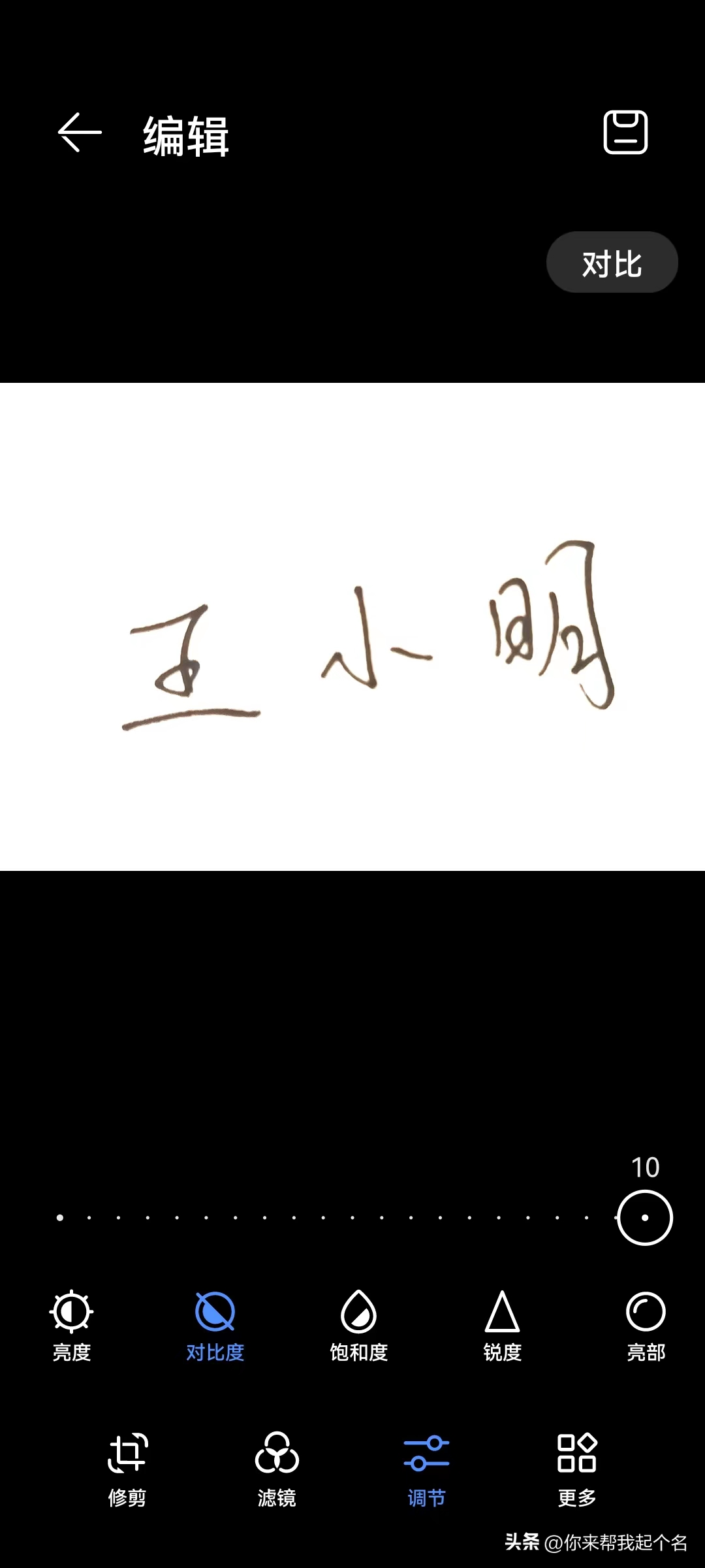 继续在第三步调节的界面里,把对比度拉到右侧最大值,OK,签名图片已经处理好了,记着要保存下来~~