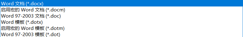 我们通常使用最多的应该有两种:doc和docx。doc是Office2003及以前的版本,docx是Office2007及以后的版本。因此,如果你使用的版本是2003及以前的版本的话,你的另存为对话框中就不会有docx类型了。