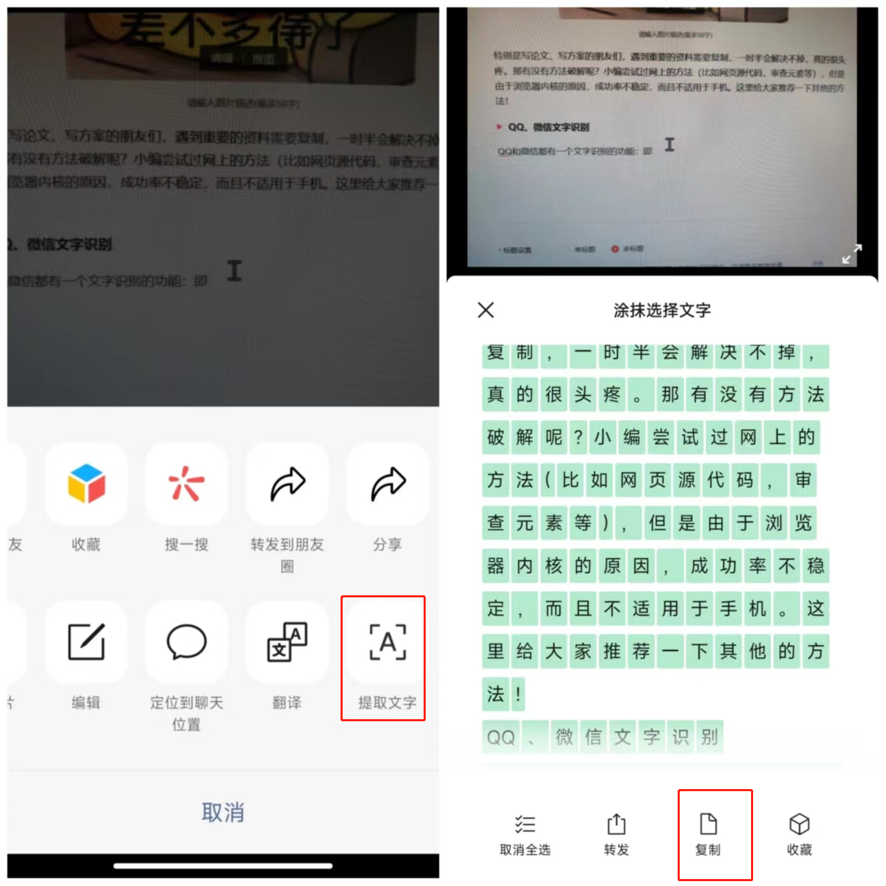 当我们在网页上遇到无法复制的内容时,直接拿出手机微信,对着屏幕把文字拍下来(手机端直接截屏即可)发给文件传输助手,然后再提取文字即可。