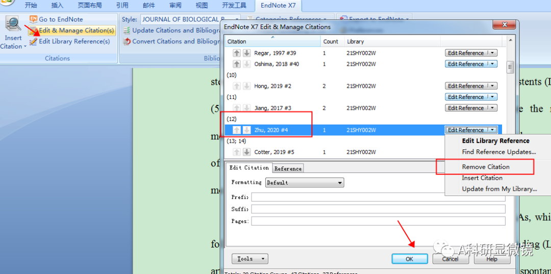 在Word中点击Edit&Manage Citations,选择需要删除的参考文献,再点击Remove Citation,点击OK即可(注意:用EndNote插入的参考文献在删除的时候不可直接选中删除,因为此处插入的参考文献是个管理器工具,而不是文本文档。要不然会发现虽然当时看起来是删除了,但是在用EndNote更新后又出现了,压根没删掉)。在删除文献后,文中参考引文的顺序、编号会自动调整