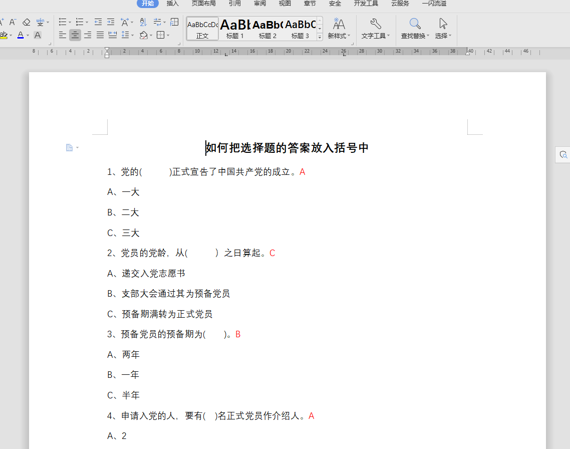 导言:有的时候在复习习题或者总结题库的时候,需要统一题目的格式,并转化为各种形式,比如把正确答案填入题干括号中、正确答案标粗变红、一键隐藏或显示答案或者让选项ABCD单独成行等很多情况。接下来我会用多期文章及视频讲解如何正确的操作。