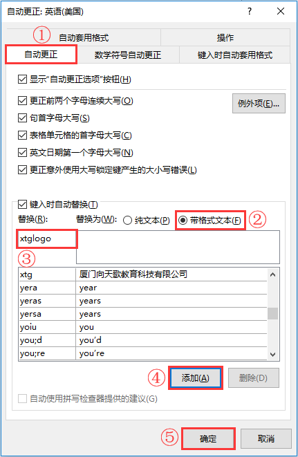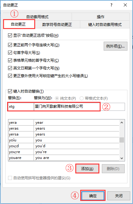 Step2:在打开的【自动更正】对话框中,在【替换】框中输入简写的英文“xtg”,【替换为】中输入“厦门向天歌教育科技有限公司”。