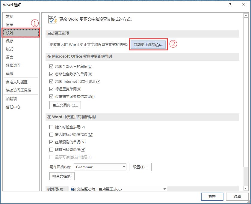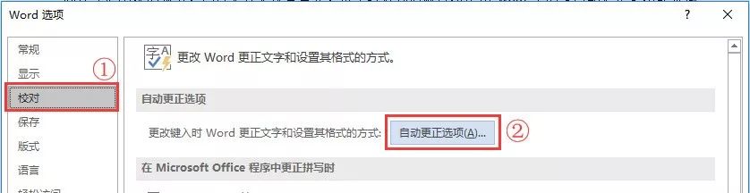 Step1:依次单击【文件】→【选项】→【校对】,单击右边的【自动更正选项】按钮。