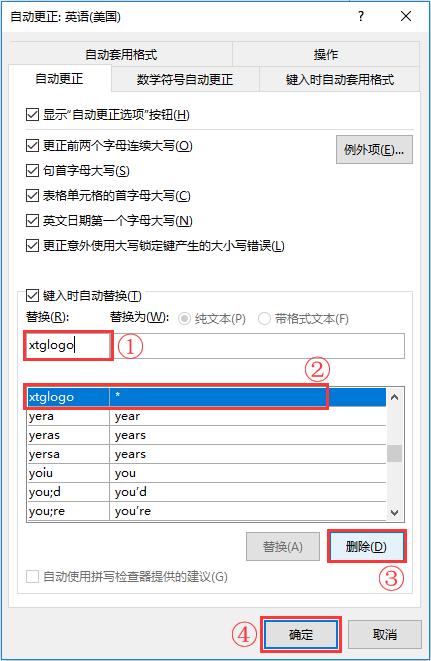 依然打开【自动更正】对话框,在【替换】编辑框中输入想要删除的字符,例如输入“xtglogo”,快速找到设置的自定义项目。