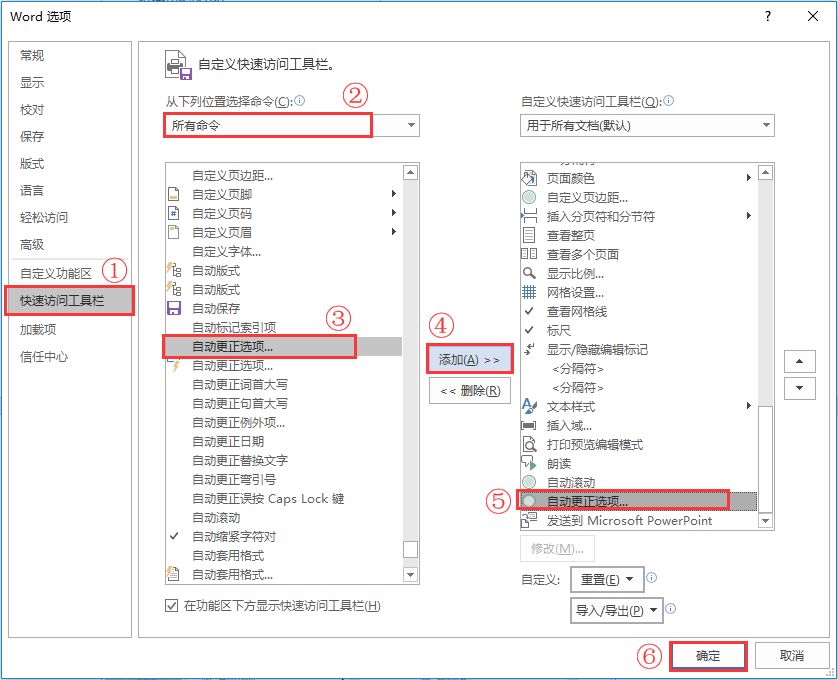 打开【自定义快速访问工具栏】,在【从下列位置选择命令】列表中选择“所有命令”,找到第一个【自动更正选项】命令,单击【添加】到快速访问工具栏即可。
