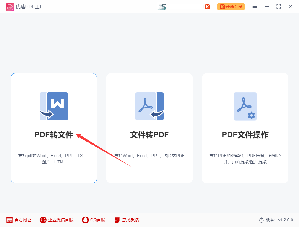 步骤1:首先把需要用的“优速PDF工厂”工具下载安装到电脑上,然后打开使用,在首页面中我们可以看到三个功能板块,因为我们是将PDF转成word,故选择【PDF转文件】功能板块。