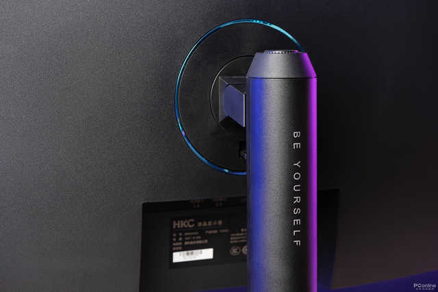 “BE YOURSELF”,但是采用同款设计的支架就对不住这句Slogan了吧,HKC C349U。它的支架接口环绕的亮蓝色圆环,再次吸引了我的目光,确实别致、醒目。