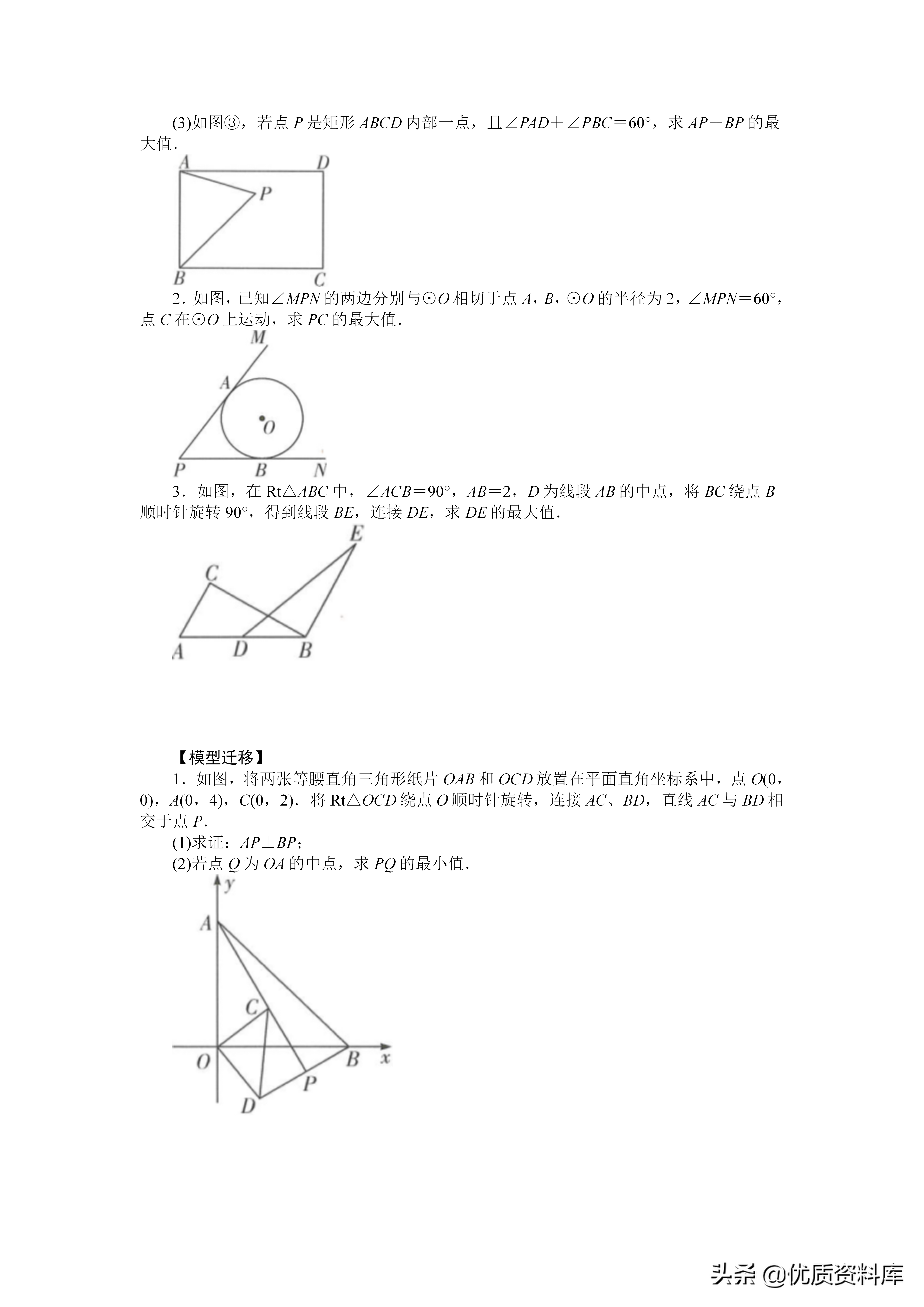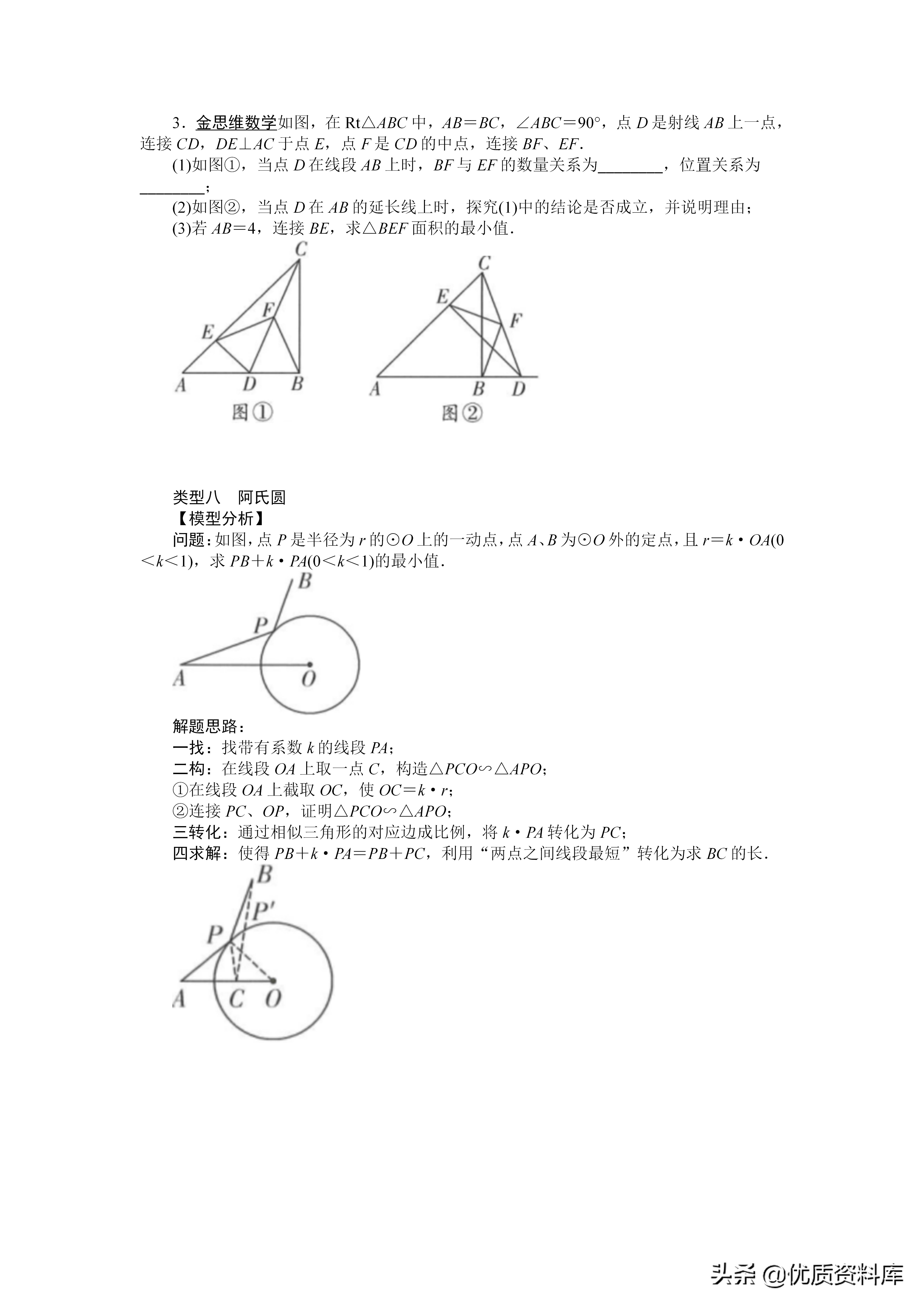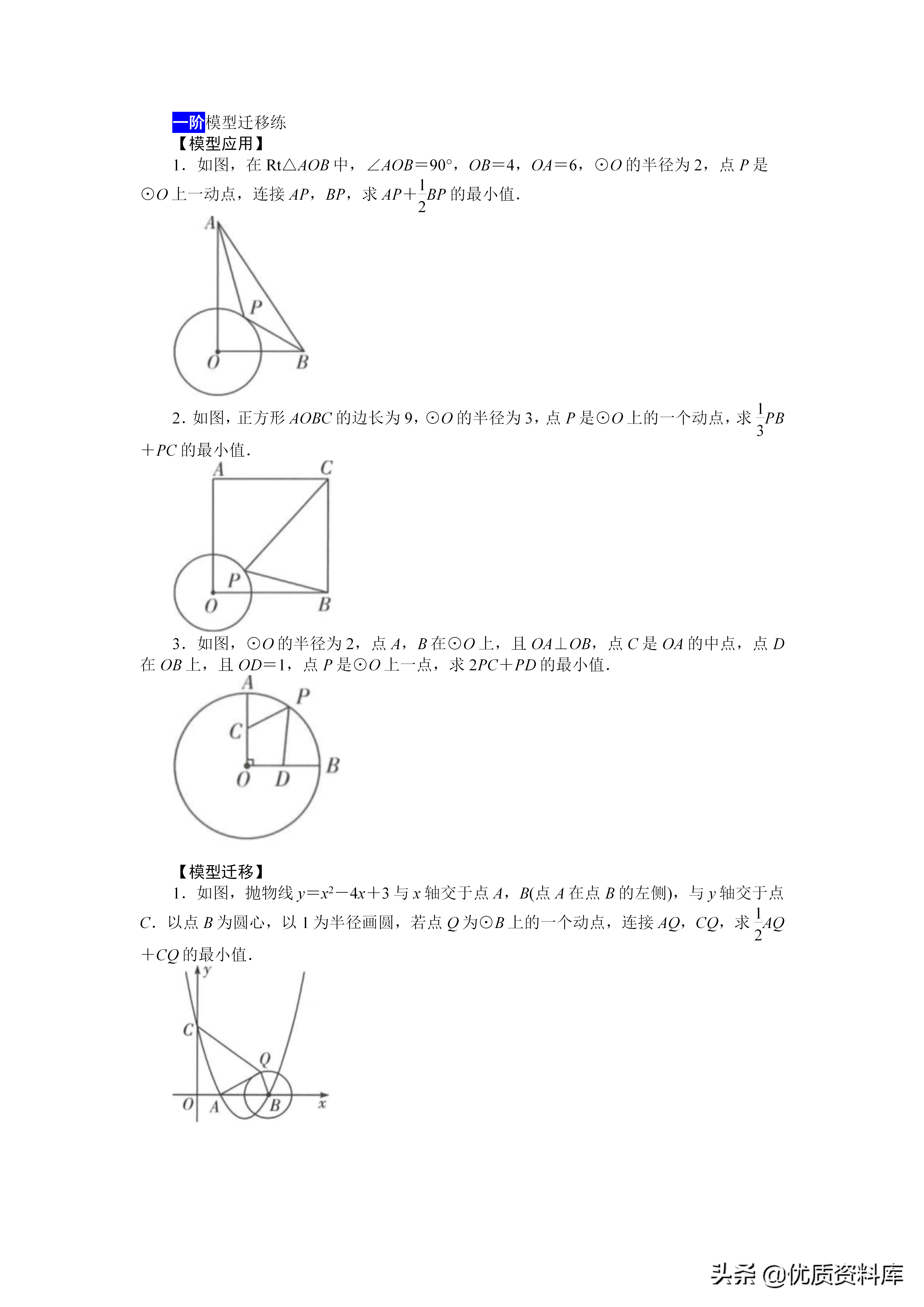 解题思路:一找:找带有系数k的线段PA二构:在线段OA上取一点C,构造△PCO∽△APO①在线段OA上截取OC,使OC=k·r②连接PC、OP,证明△PCO∽△APO三转化:通过相似三角形的对应边成比例,将k·PA转化为PC:四求解:使得PB十k·PA=PB十PC,利用“两点之间线段最短”转化为求BC的长