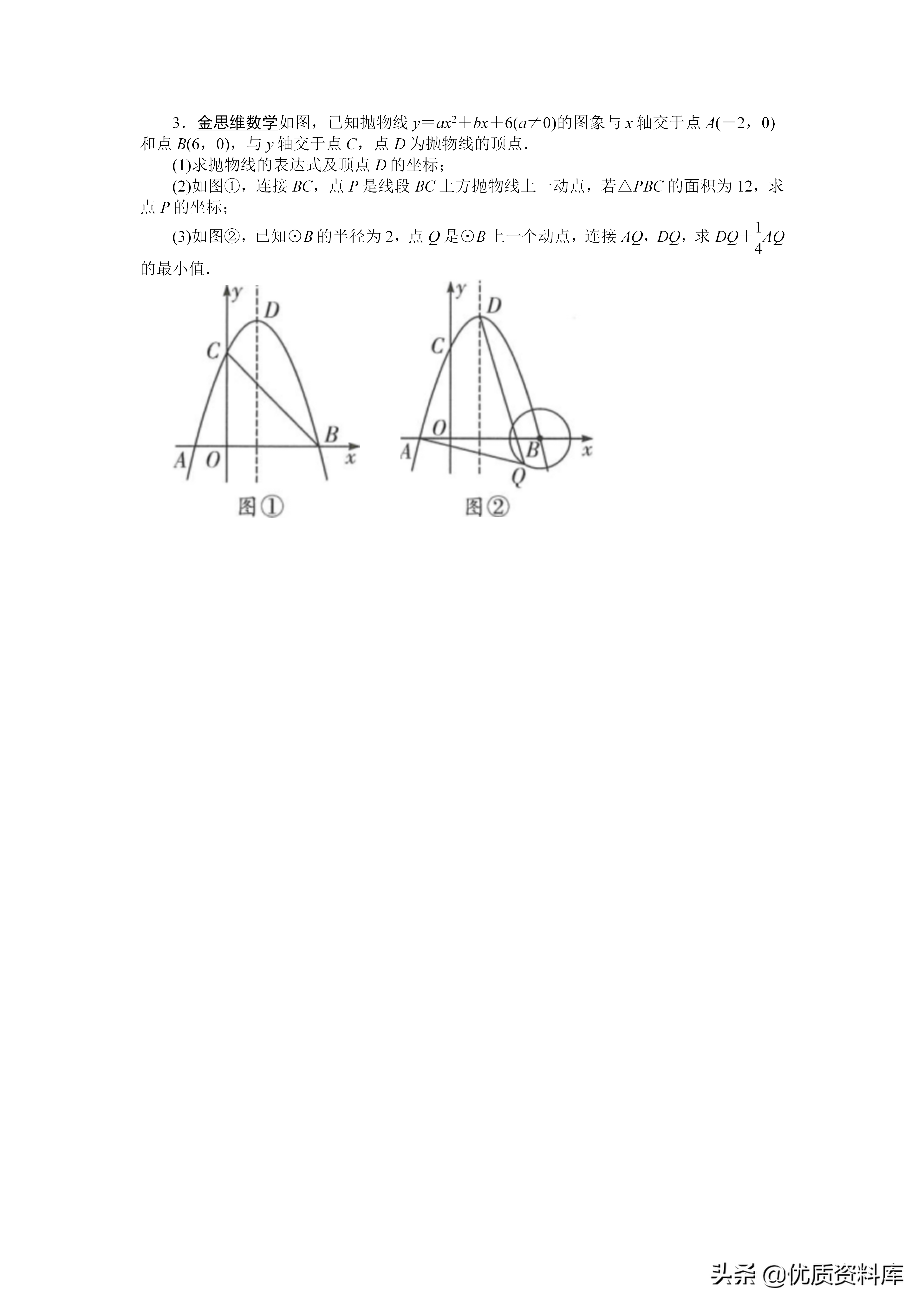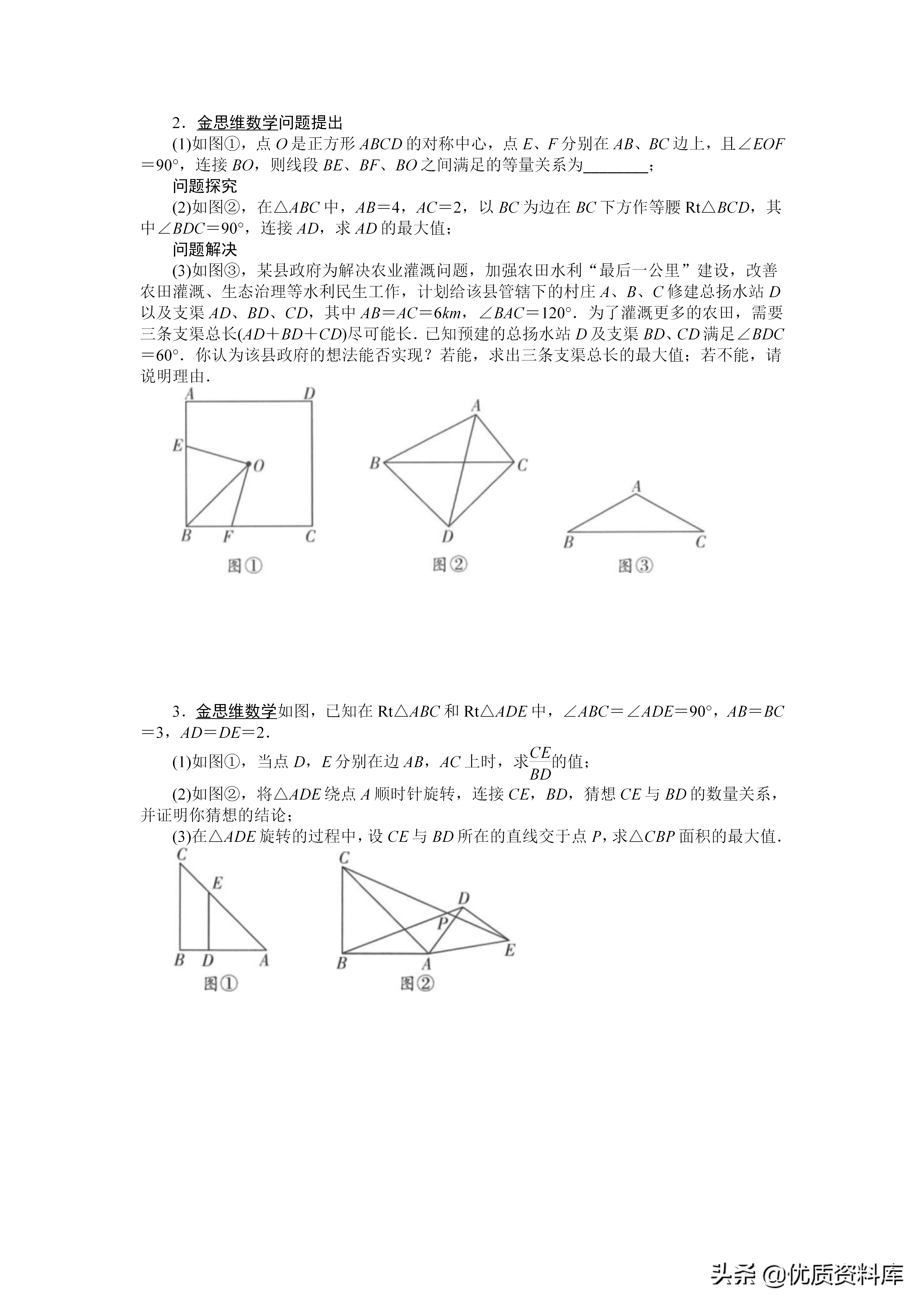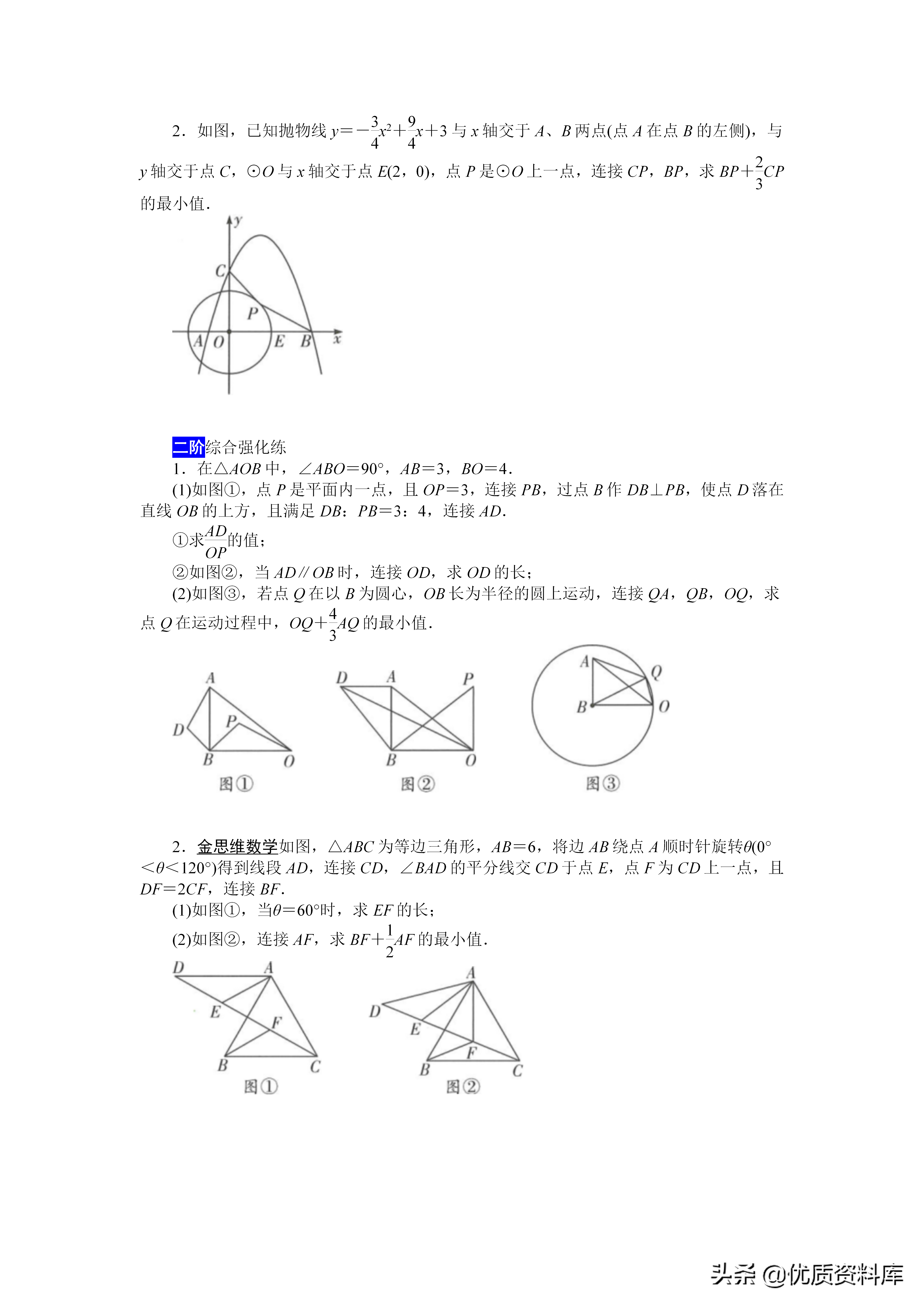 解题思路:一找:找带有系数k的线段PA二构:在线段OA上取一点C,构造△PCO∽△APO①在线段OA上截取OC,使OC=k·r②连接PC、OP,证明△PCO∽△APO三转化:通过相似三角形的对应边成比例,将k·PA转化为PC:四求解:使得PB十k·PA=PB十PC,利用“两点之间线段最短”转化为求BC的长