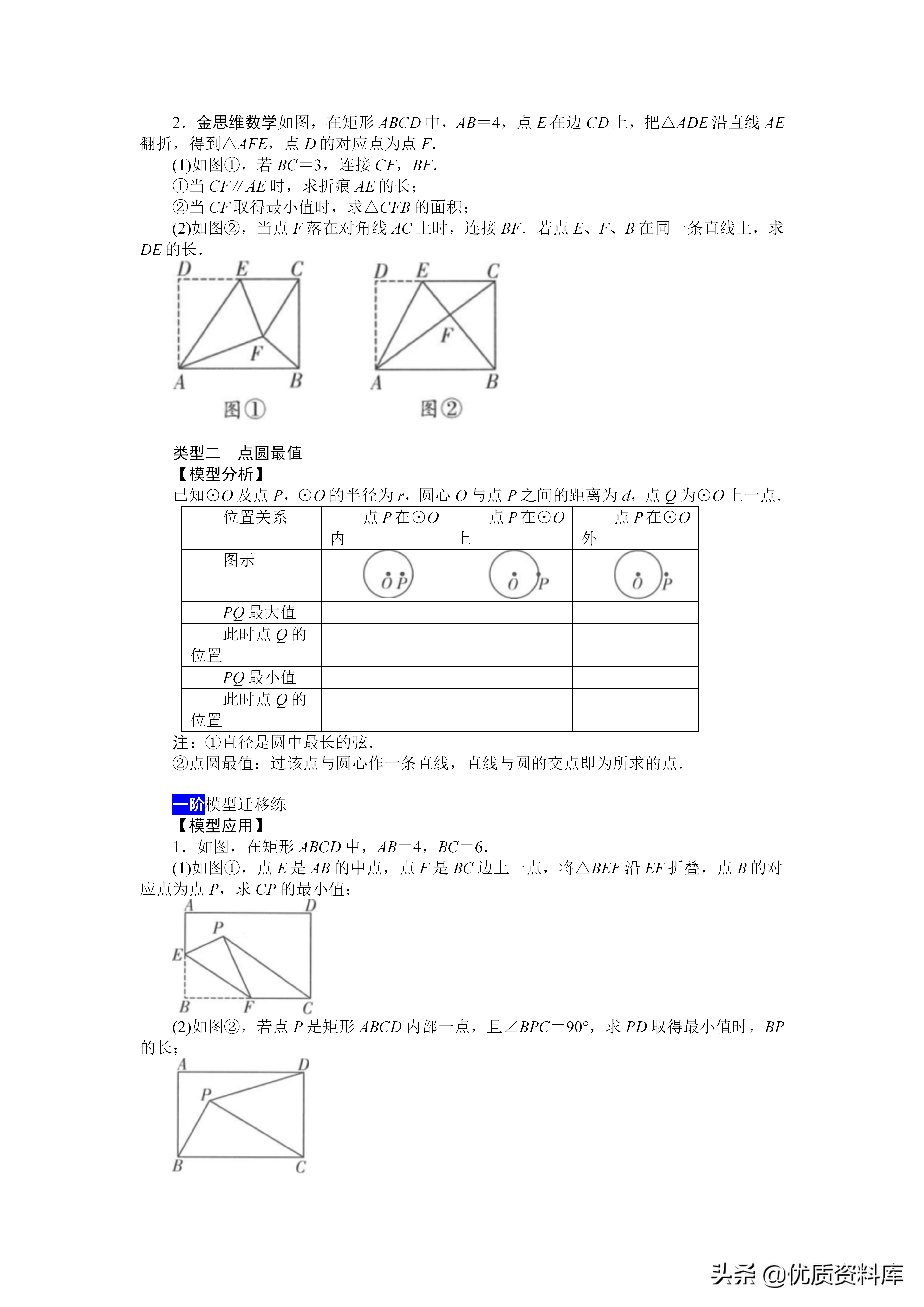 ①直径是例中最长的弦②点圆最值:过该点与圆心作一条直线,直线与圆的交点即为所求的点3.
