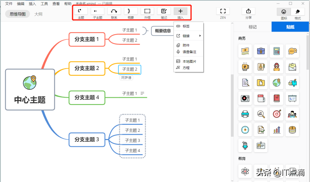 选择一个模板后进入编辑界面:双击主题框可以编辑主题的文字,使用Enter键可以添加同级主题、使用Tab键添加子主题、使用Delete键删除不需要的主题。也可以选择待编辑的主题框,点击工具栏上的“主题”、“子主题”等按钮添加对应主题,另外可以通过“概要”、“笔记”等工具栏添加概要笔记信息,通过“插入”按钮插入标签、链接、附件、图片、语音等信息。