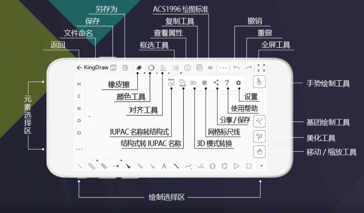 KingDraw是一款专业型化学结构式编辑器,支持APP、PC、IPad多个终端,官方的宣传是:我们致力于研发化学行业相关软件,打造化学家的专属工作站。