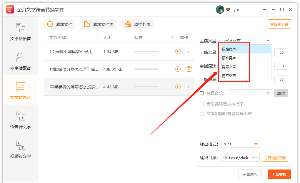 第二步、我们可以将多个word文档进行处理,在右上角的设置中选择自己心仪的主播类型即可,这里分别有以下四种可选;