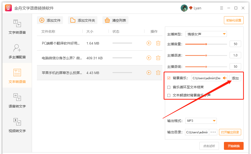 第一步、首先,在电脑上打开语音转换工具,然后点击选择“文本转语音”功能,然后再将需要转换的word文档添加到此处;
