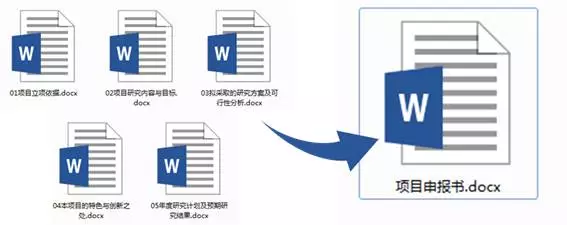 首先将子文档按实际顺序编号,如:01项目立项依据、02项目研究内容与目标、03拟采取的研究方案及可行性分析、04本项目的特色与创新之处、05年度研究计划及预期研究结果。