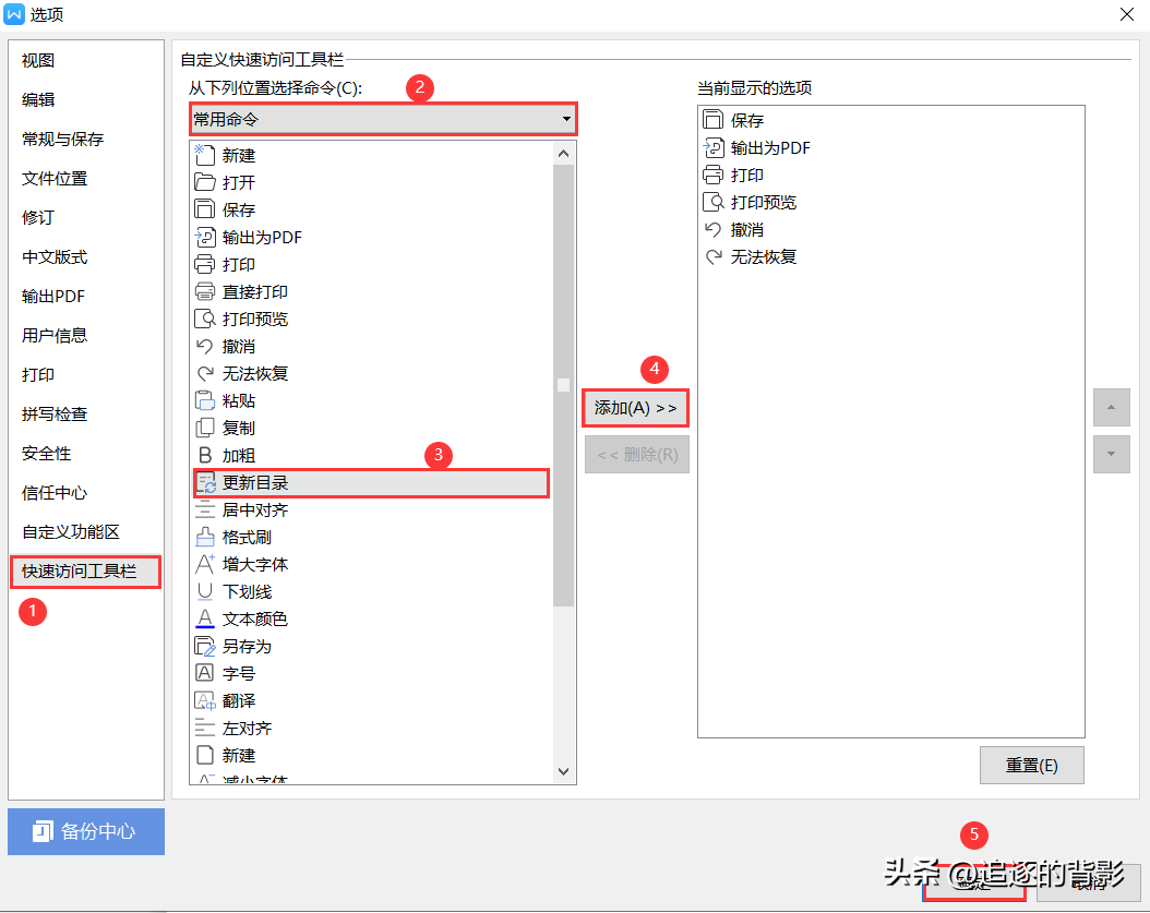 5.3.在弹出的“选项”对话框中单击“快速访问工具栏”,再点击“常用命令”,可以在列表中单击选项来切换不同的选项卡