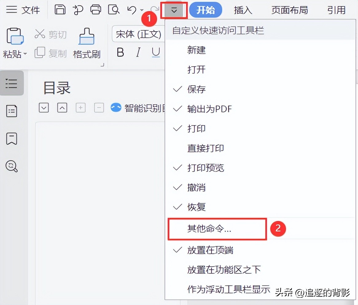 4.那么如何把常用的功能放在这里呢?请看下面的步骤:1.单击“快速访问工具栏”右侧的下拉按钮,在菜单中选择“其他命令”命令2.若是不方便确认“快速访问工具栏”的位置,我们也可以点击左侧菜单的“文件-选项”,跳转到“快速访问工具栏”的设置页面