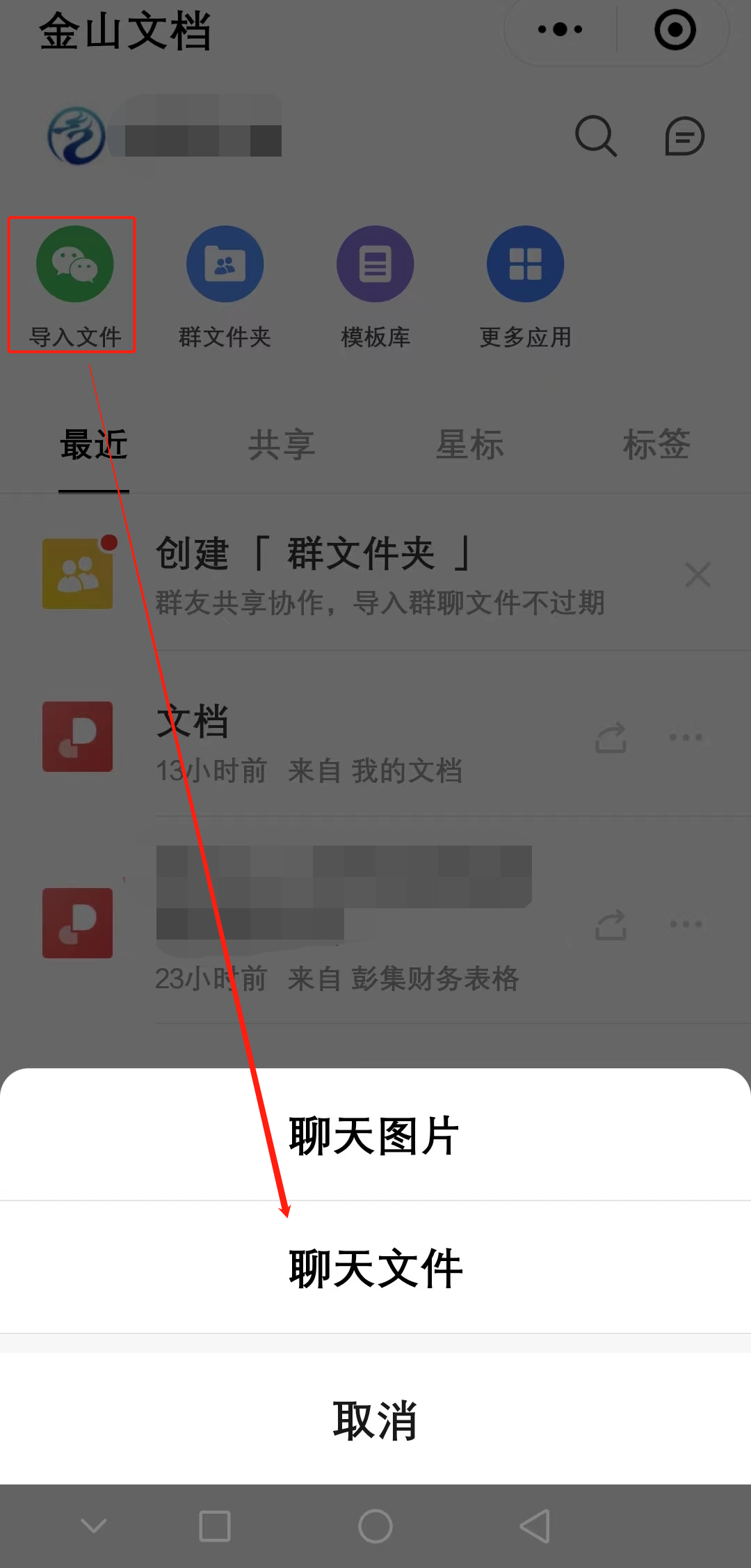 4、点击打开金山文档小程序,首次打开会提示微信登陆,打开后点击导入聊天文件。