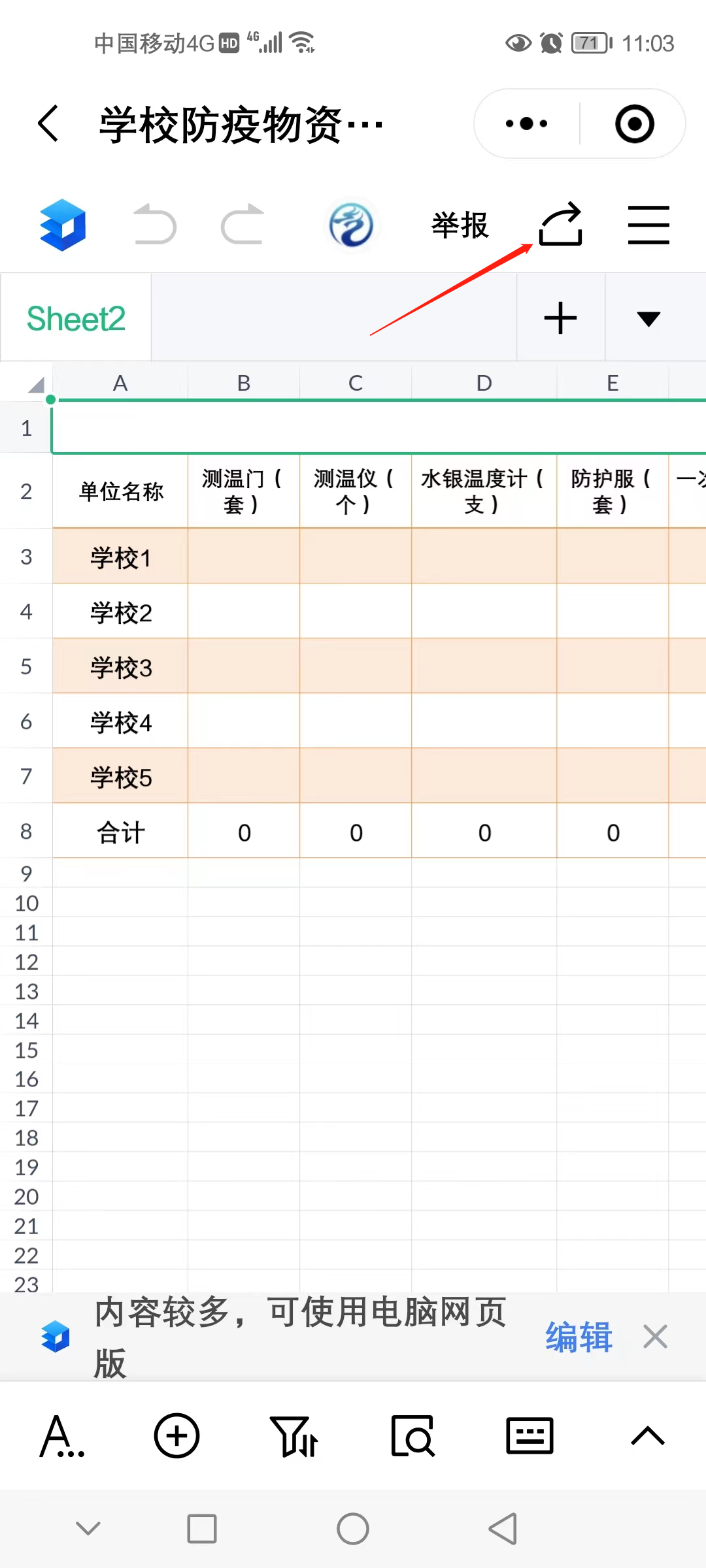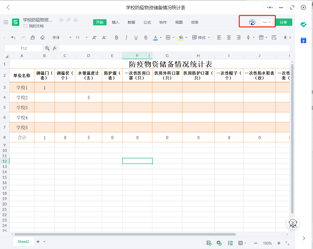 1、首先需要准备好一篇协作的文档,我给准备了一个防疫物资统计表,如下图,是在电脑上做好的,毕竟在电脑上制作表格更方便一些,上传到微信中即可。也可以直接使用别人发到你微信中的文件,当然也可以在在金山文档中直接创建,这个以后再给大家介绍。