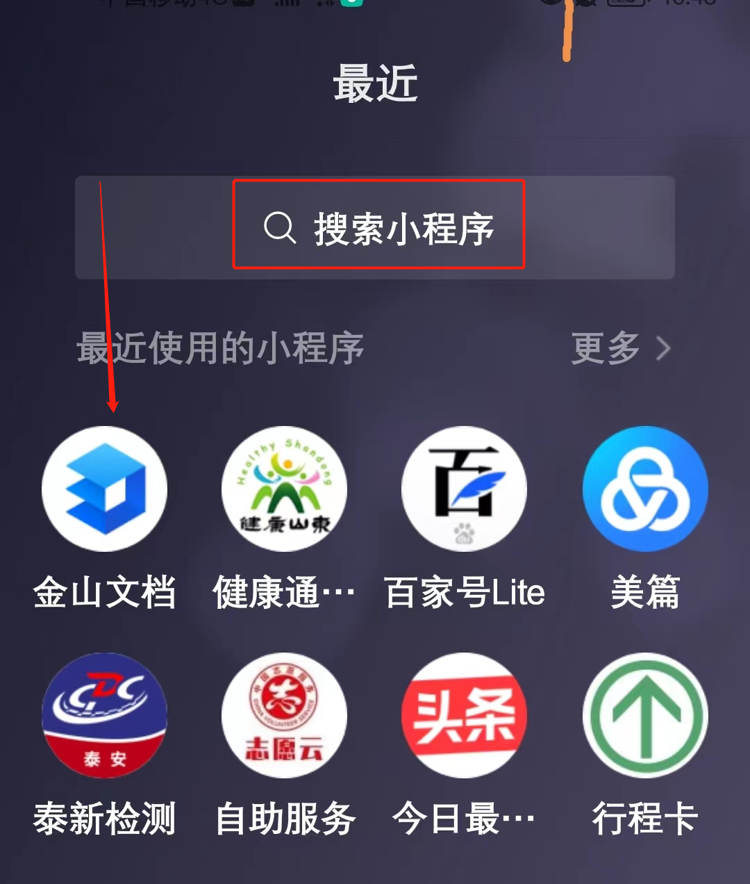 3、打开手机微信,下拉或在发现页找到小程序,如果最近打开过金山文档,在列表中直接点击金山文档,如果列表中没有,请搜索找到金山文档小程序。