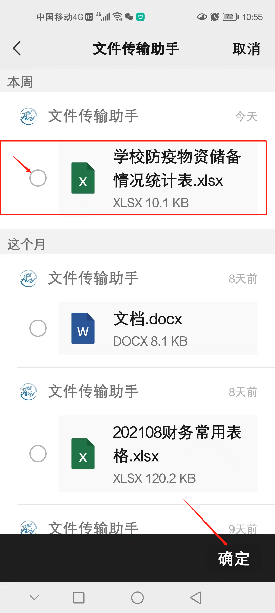 5、选择微信聊天或微信群,里面有该聊天的文件列表,找到需要共享协作的文档,点击选中,点击确定。
