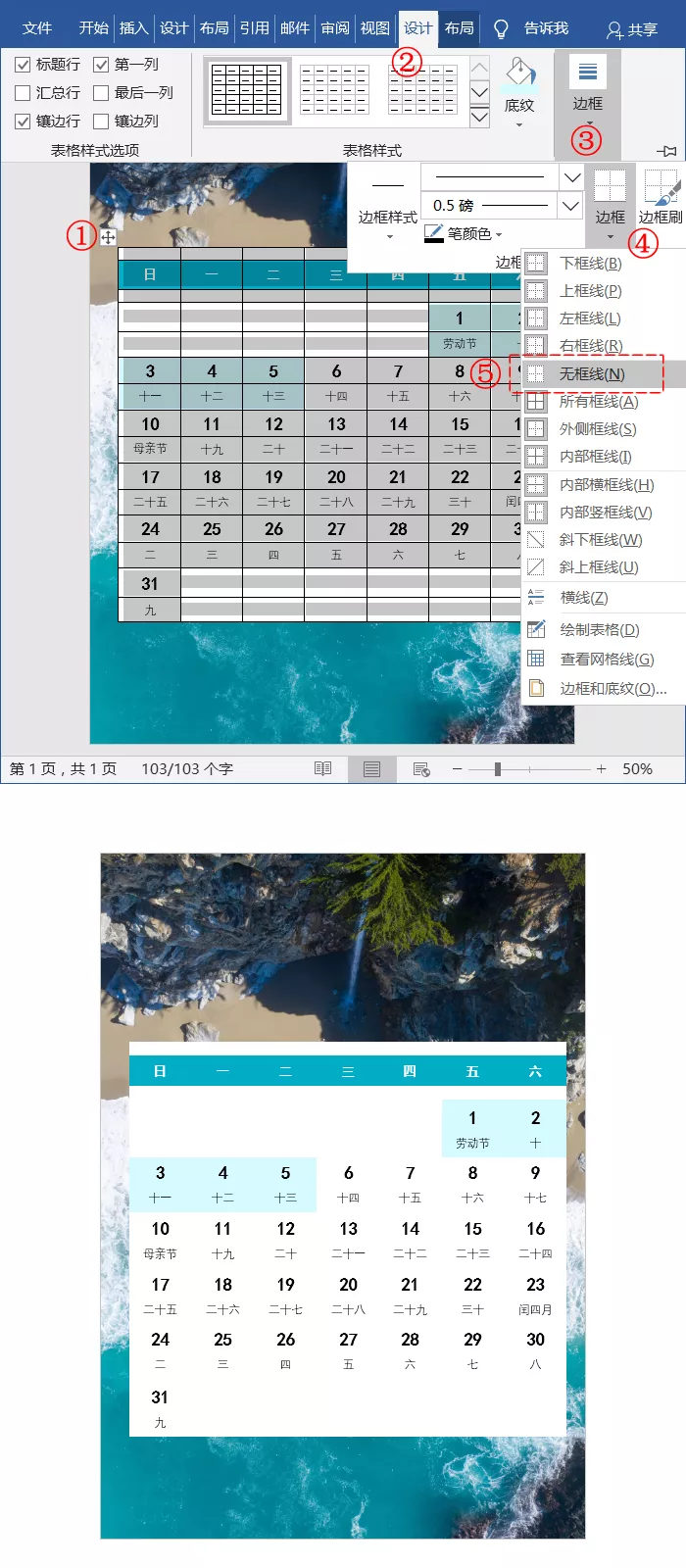 26、选中整个表格进入「设计」-「边框」-「无框线」,取消边框线。