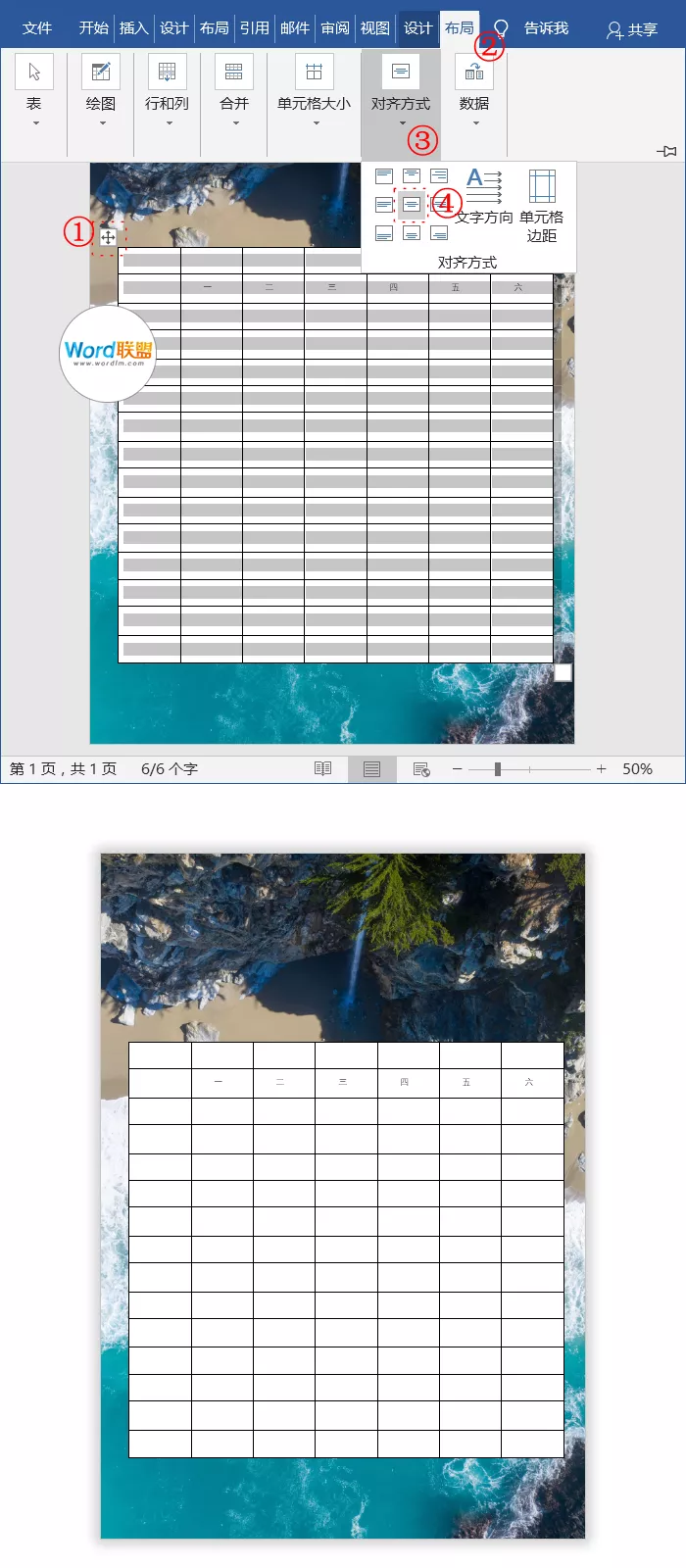 09、选中整个表格,进入「布局」-「对齐方式」-「水平居中」。这样我们在表格中录入的内容就会居中对齐。
