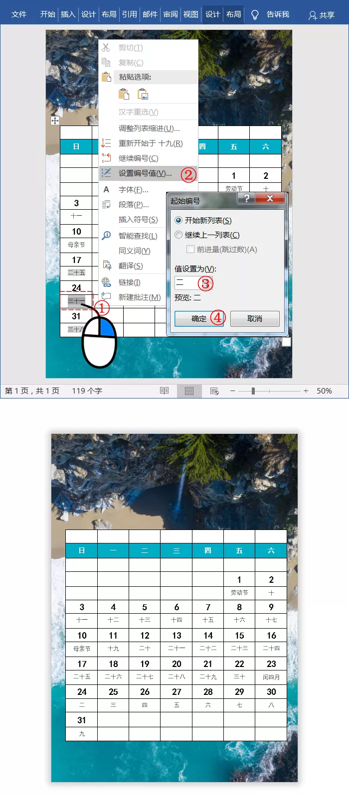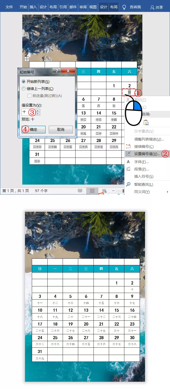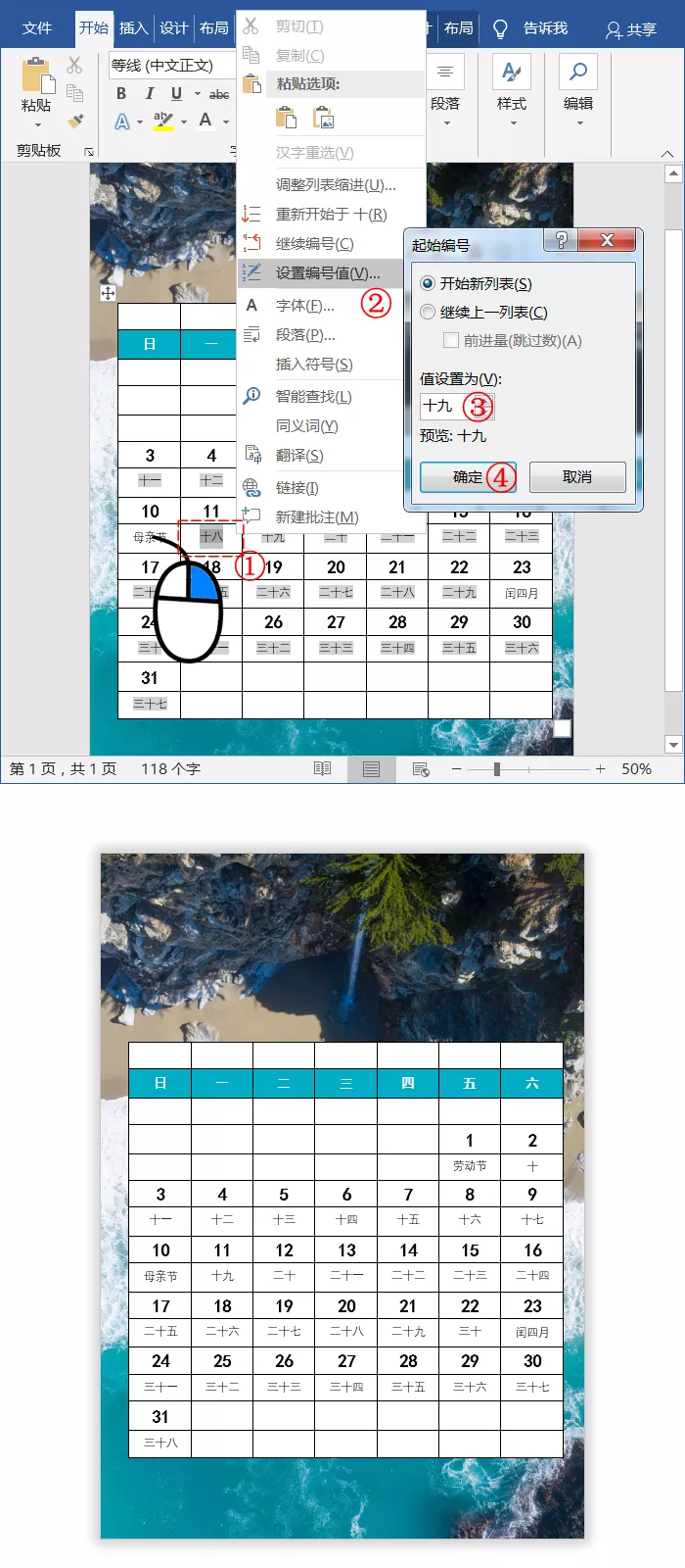 19、右键点击第一个阴历日期,选择「设置编号值」,在「起始编号」中将「值设置为」“十”确定。