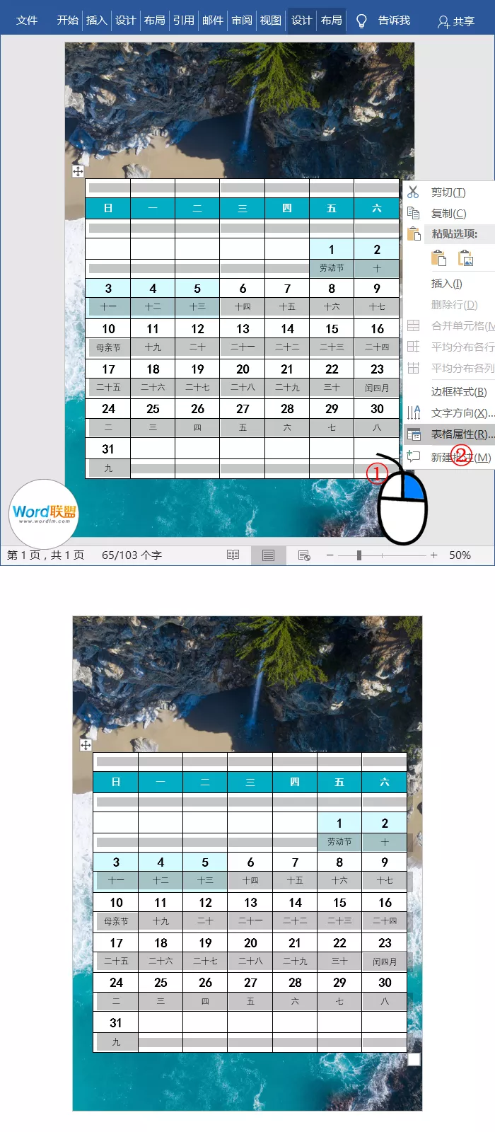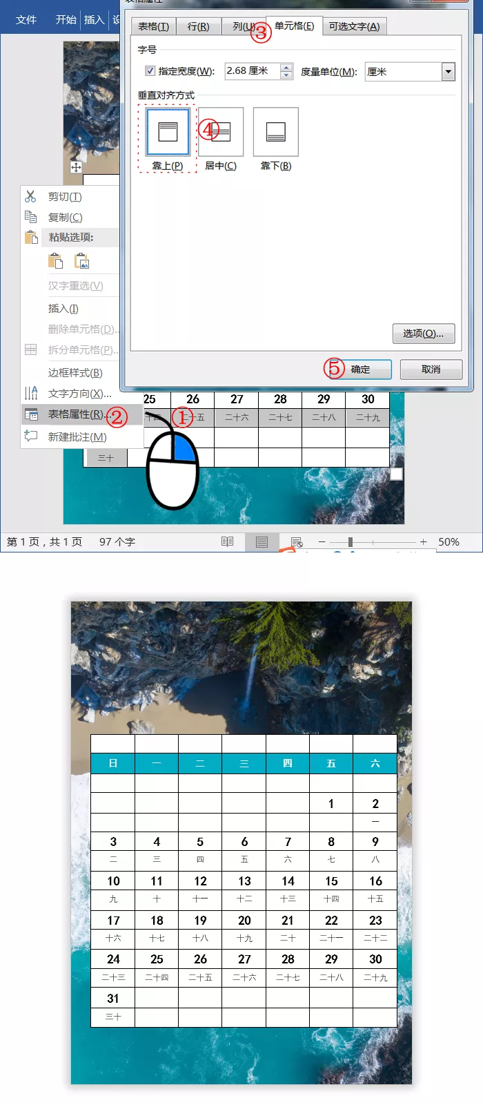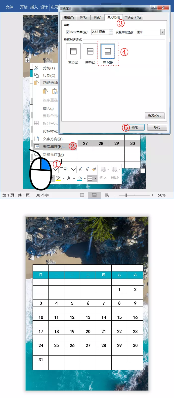 16、然后右键单击任意被选中的单元格,选择「表格属性」-「单元格」-「靠下」。