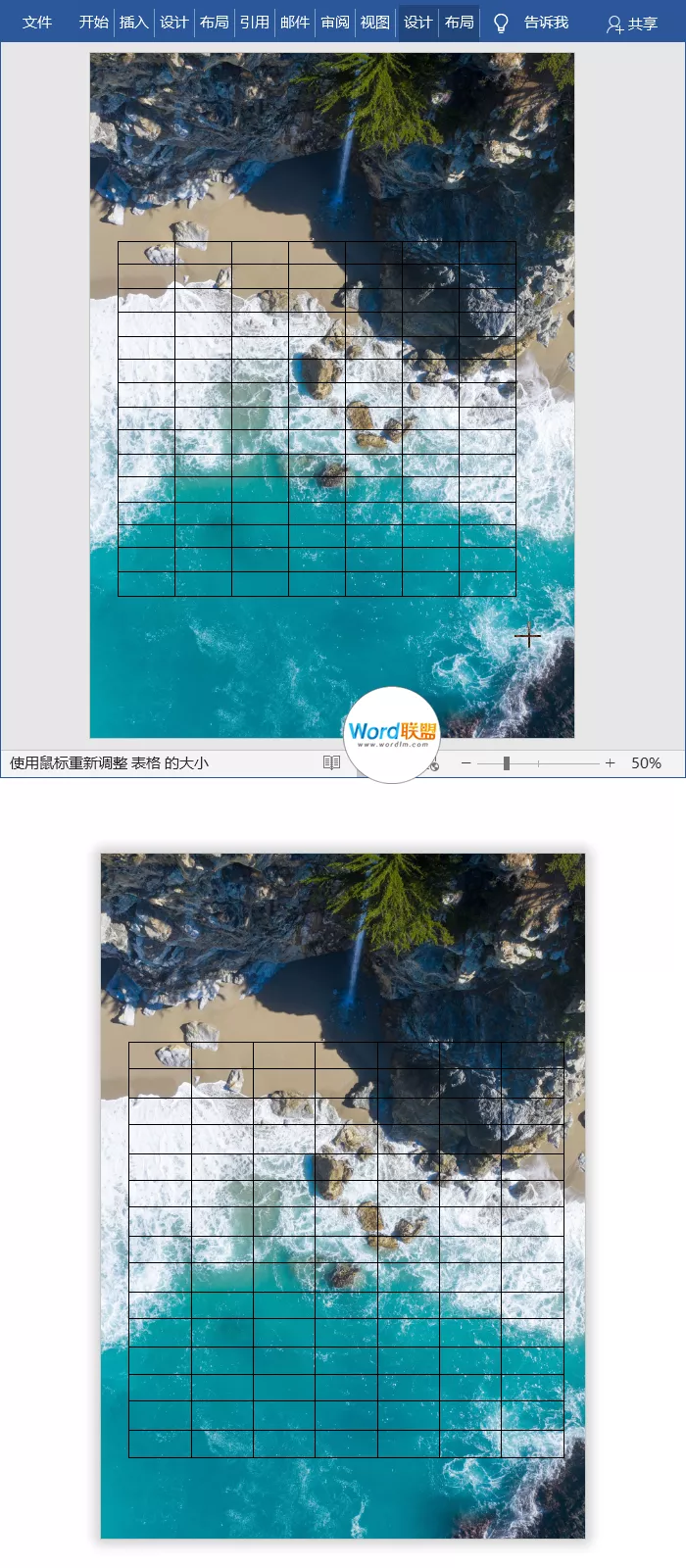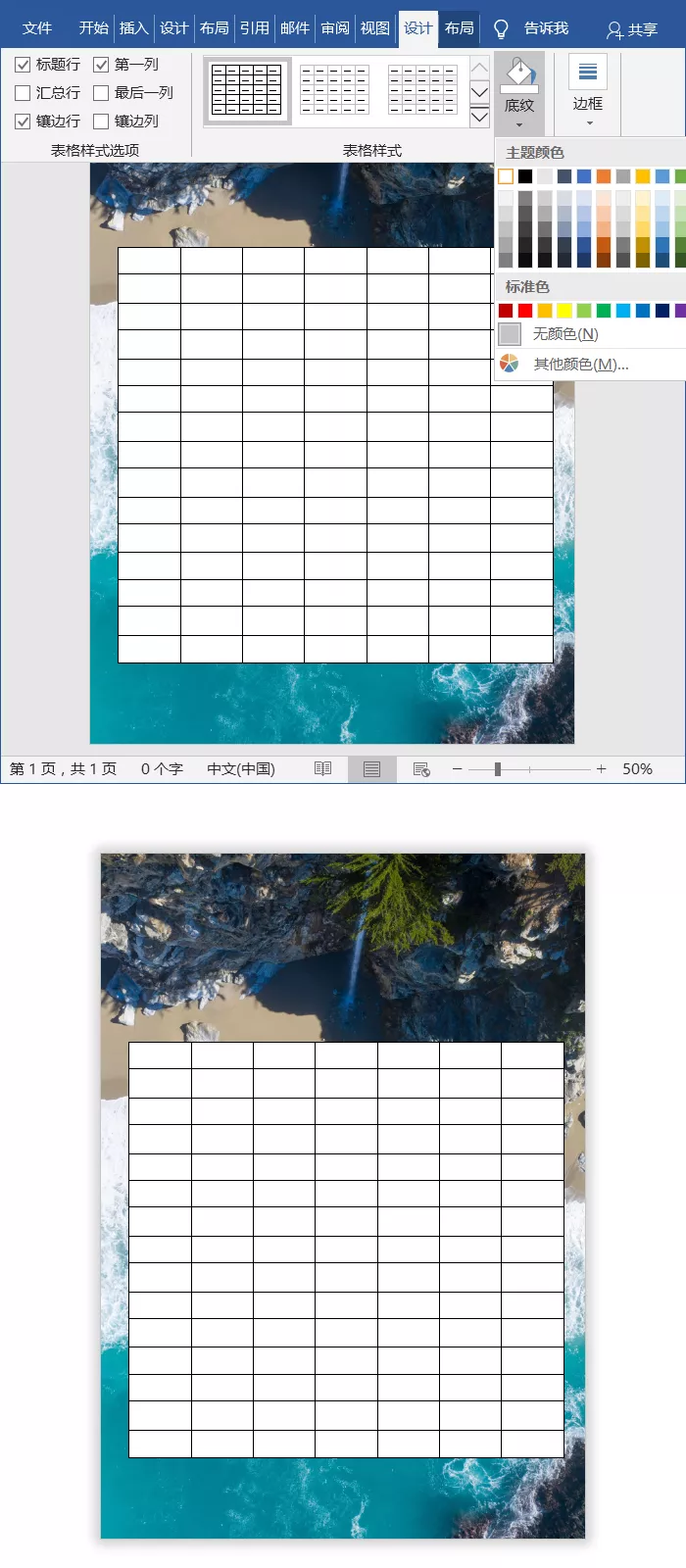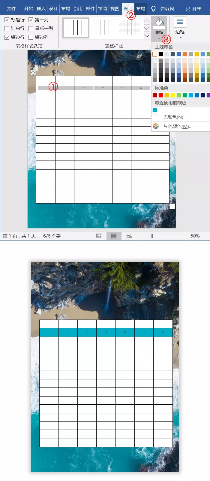 06、选中表格,进入「设计」-「底纹」,填充为白色底纹。!