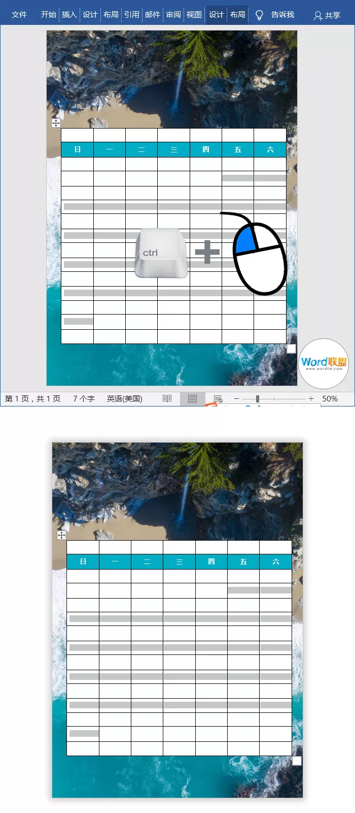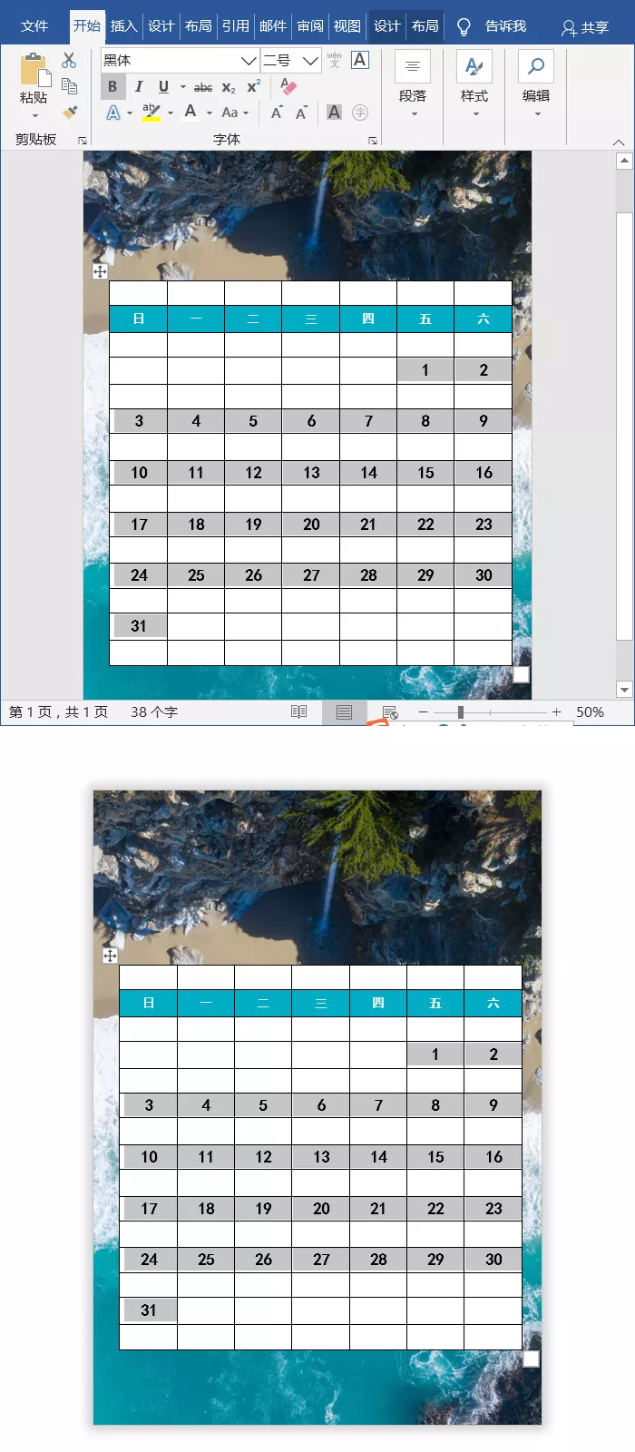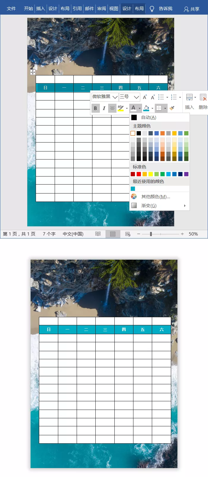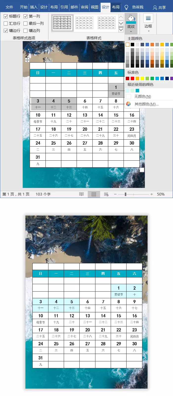 11、选中第二行所有单元格,进入「设计」-「底纹」设置一种颜色。这里是星期所在位置,所以要突出显示。