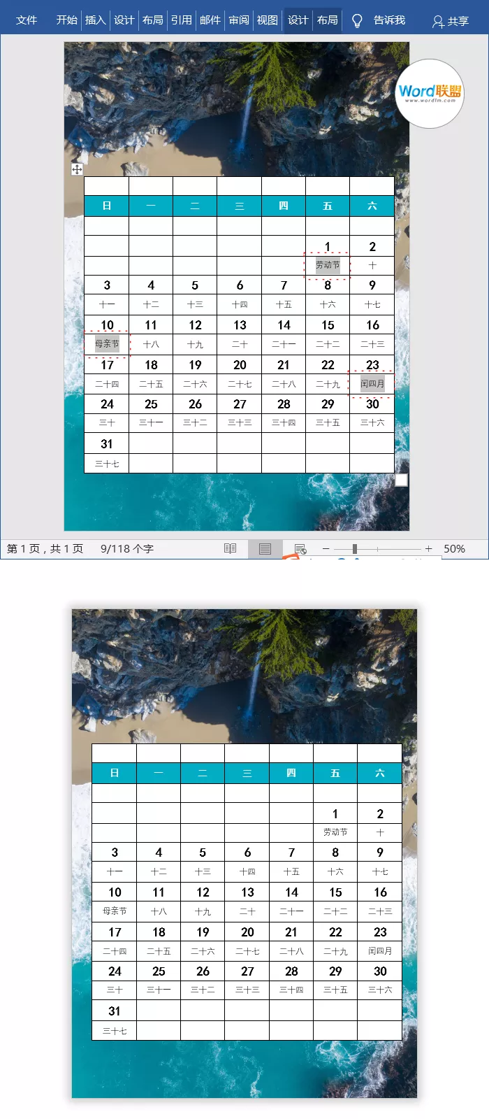 20、将特殊日期下面修改一下,5月1日下面改成劳动节;10日母亲节等(大家可以翻阅一下日历来修改)。