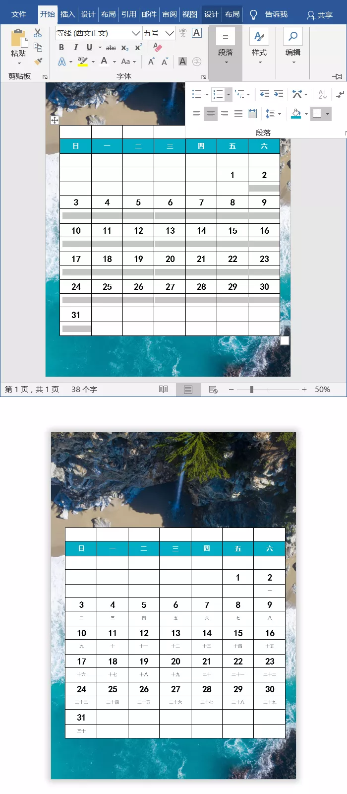 17、然后选中日期下方所有单元格,第一个日期下面的可以不用选哈!然后,同样利用编号来填充阴历日期。如下图所示: