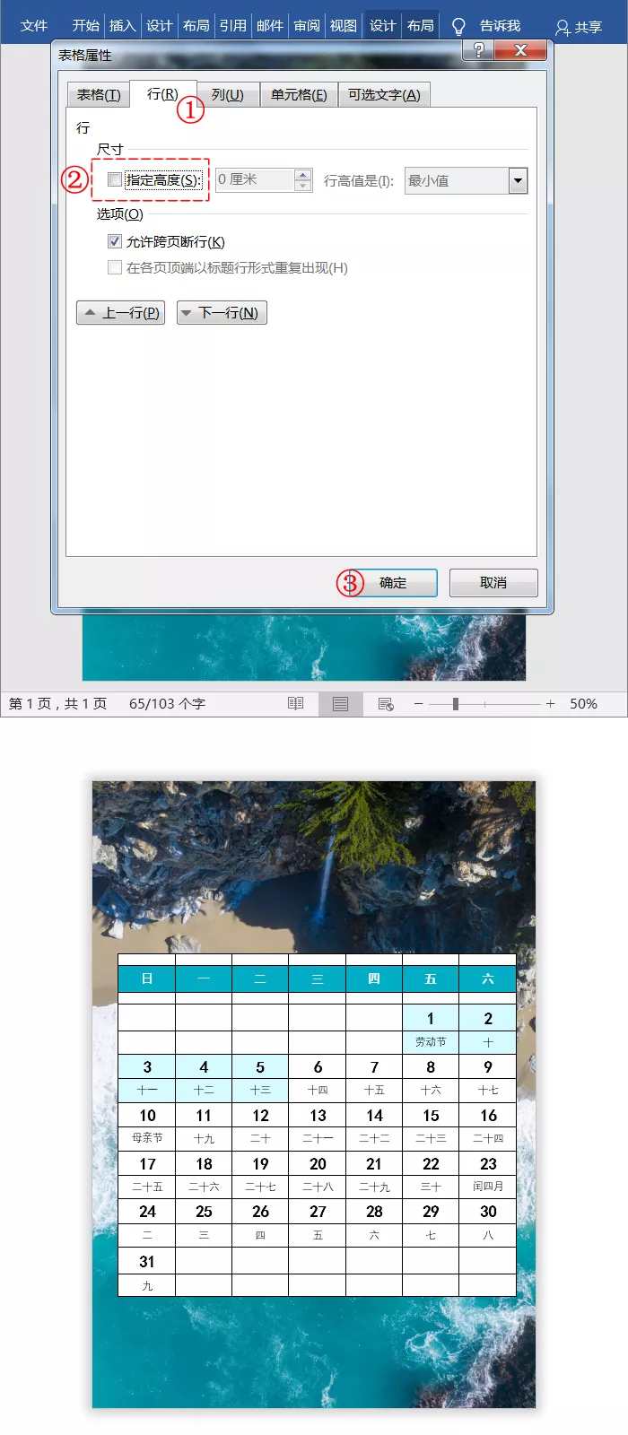 25、进入「表格属性」后选择「行」,将「指定高度」前面的钩取消掉,确定。