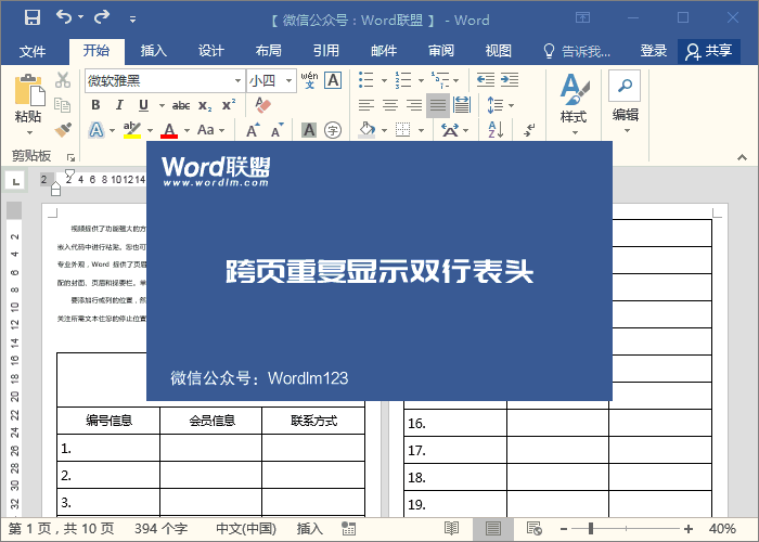 有时候在Word中制作长表格时,会占据几页的位置。而表头在最前面,后面几页没有表头,对于预览也是不太方便。所以,这里就来教下大家,在Word中制作长表格的时候如何将头部跨页重复显示出来。